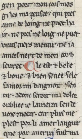 gen port mon cors mes gi les ma pensee; qui pres aime de loing ne puet ha ir. ne pres ne loig ne puet vrais cuers mentir. ne ia amors nert de mon cors seuree. Cle est (et) bele (et) bone (et) bien senee. sele samor mi daignoit (con)sen tir. adonc seroit ma dolor oubliee ie lamerai sen da uoie morir. car plus me plest por li amer languir que par autrui fust ma dolor sanee. En poi deu re fu bien mamort iu ree. sanz moi auant de fier (et) garnir. si oil ri ant sa bouche coloree ses biaus parlers qui tant plest a oir. bien mi sorent deceuoir (et) tra ir quencontre aus trois na ma reson duree To te biaute est en li aunee sousfrete en ot dex a moi |