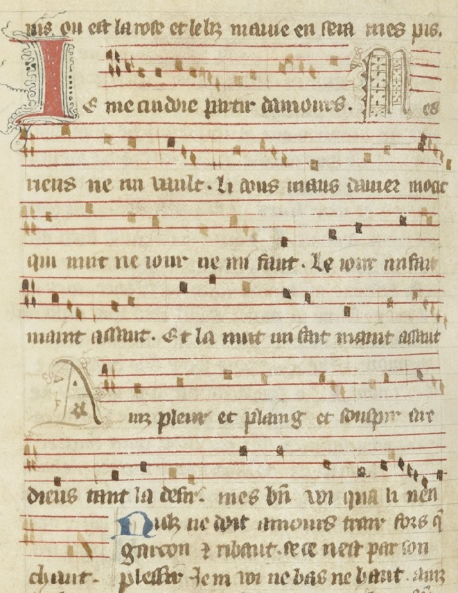 | Ie me cuidoie partir damours. Mes riens ne mi uault. Li duis maus damer mocit qui nuit ne iour ne mi faut. Le iour mi fait maint assaut. (et) la nuit mi fait maint assaut Ainz pleur et plaign et souspir car dieus tant la desir. mes b(ie)n uoi qua li nene chaut.