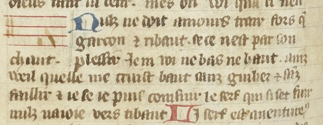 | Nulz ne doit amours trair fors q(ue) garcon (et) ribaut. se ce nest par son plessir. Je ni uoi ne bas ne haut. ainz uoeil quelle me truist baut sanz quilier (et) sa(n)z faillir (et) se ie puis comsiur le serf qui si set fuir nulz naioie uers tibaut |