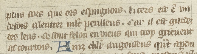 | Ainz ch(aua)l(ie)r angoisseus q(ua)nt ap(ar)du son h(er)nois ne uielle qui art li feus mesons ui(n)s et blez (et) pois ne chaciere Qui p(re)nt cois ne moi- gne lururieus. nest en uersmoi angoisseus que ie ne soie de ceulz quiai(m)me(n)t de sor leur pois. |