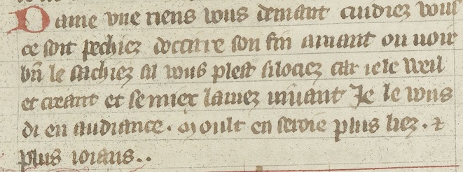 | Dame une riens uous demant cuidiez uous ce soit pechiez doccire son fin amant ou uoir b(ie)n le sachiez sil uous plest silociez car iele uueil et creant et semie(us) lamez uiuant Je le uous di en audiance. Moult en seroie plus liez. (et) plus ioians. . |