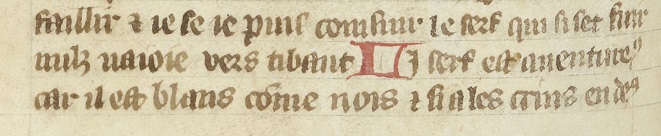 | Li serf est auenture(us) car il est blans co(m)me nois (et) si a les crins ende(us) plus sors que ors espaignois. Li cers est e(n) un defois alentrer m(u)lt perilleus. Car il est gardez de leus. Ce sont felon enuieus qui trop grieuent as courtois.