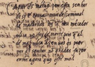 | Ca par d(eu)s malu(os) per esta senhor de sy e cousa mui descomunal de matardes mj(n) q(ue) heu me(re)cedor nu(n)ca u(os) foy de morte pois q(ue) al de mal nu(n)ca d(eu)s en uos q(ui)s poer por d(eu)s senhor no(n) q(ue)rades fazer enmi(n) agora q(ue)u(os) este mal |