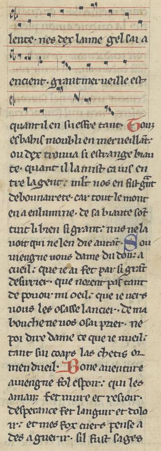 | Bone auenture auiengne fol espoir; qui les amanz fet uiure et resioir. desperance fet languir et dolo ir; et mes fox cuers pense a des aguerir. sil fust sages il me feist morir. pour ce fet bon de la folie auoir; quen t(ro)p grant sens puet il bien mes choeir. |